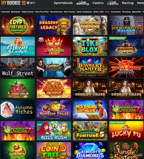 Along with their Sportsbook and Racebook MyBookie also offers a huge amount of different casino games which includes hundreds of different slots. You'll also find all the table favourites such as Blackjack & Roulette and even a dedicated live dealer section for the ultimate true to life experience.